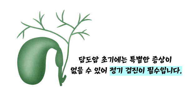 즉, 담도암은 ‘증상이 늦게 나타나는 암’이므로 위험 요인을 갖고 있는 사람은 정기적인 건강검진이 매우 중요합니다.